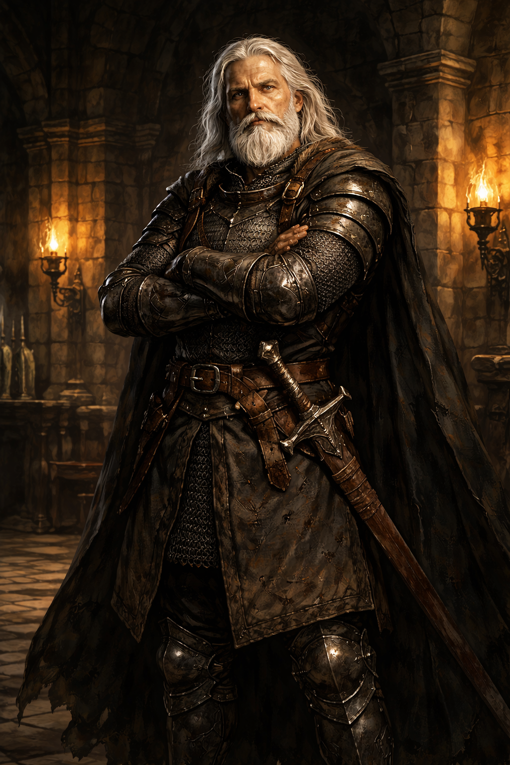 Homme de soixante ans aux cheveux et à la barbe entièrement blancs, Borwald a servi sous Dagmar pendant trente ans comme lieutenant puis conseiller. Son surnom lui vient autant de sa chevelure que de son caractère — ni chaud ni froid, pragmatique, imperméable aux flatteries comme aux intimidations. Il dirige la baronnie de facto depuis la mort de Dagmar, en attendant qu'Aldaric gagne la maturité nécessaire.