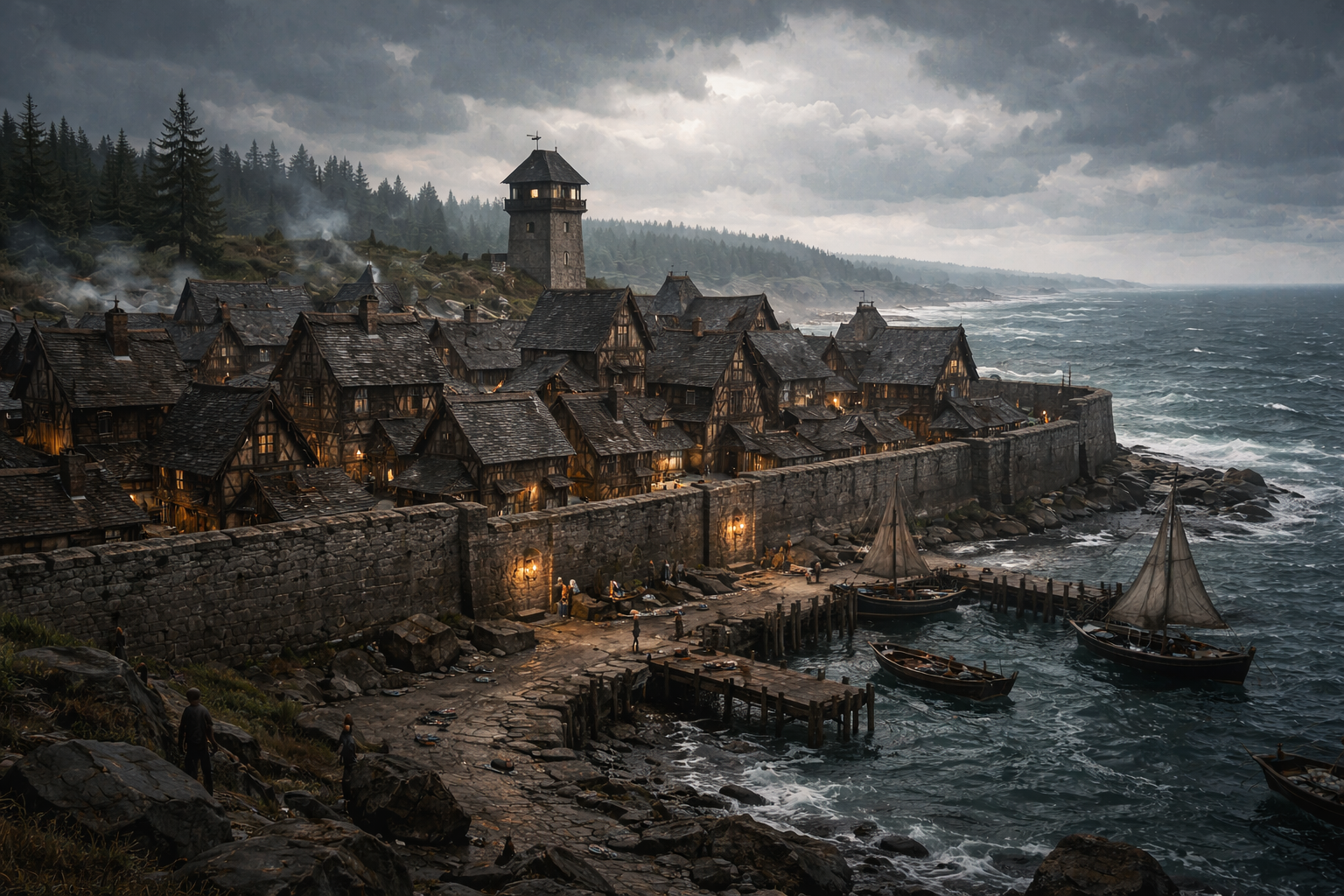 Mastelas est une bourgade ancienne dont les origines remontent à plusieurs siècles, bien avant la fondation du royaume du Norwold. Le village est ceint d'une muraille de pierre de quatre mètres de haut, assez épaisse pour que les défenseurs puissent y circuler et tenir un tir soutenu. À l'intérieur des remparts, les maisons sont hautes — deux ou trois étages —, serrées les unes contre les autres et orientées sud pour lutter contre les vents du nord. Les toits sont en ardoise grise, les façades en bois sombre traité au goudron. L'ensemble donne une impression de solidité sombre, presque austère.