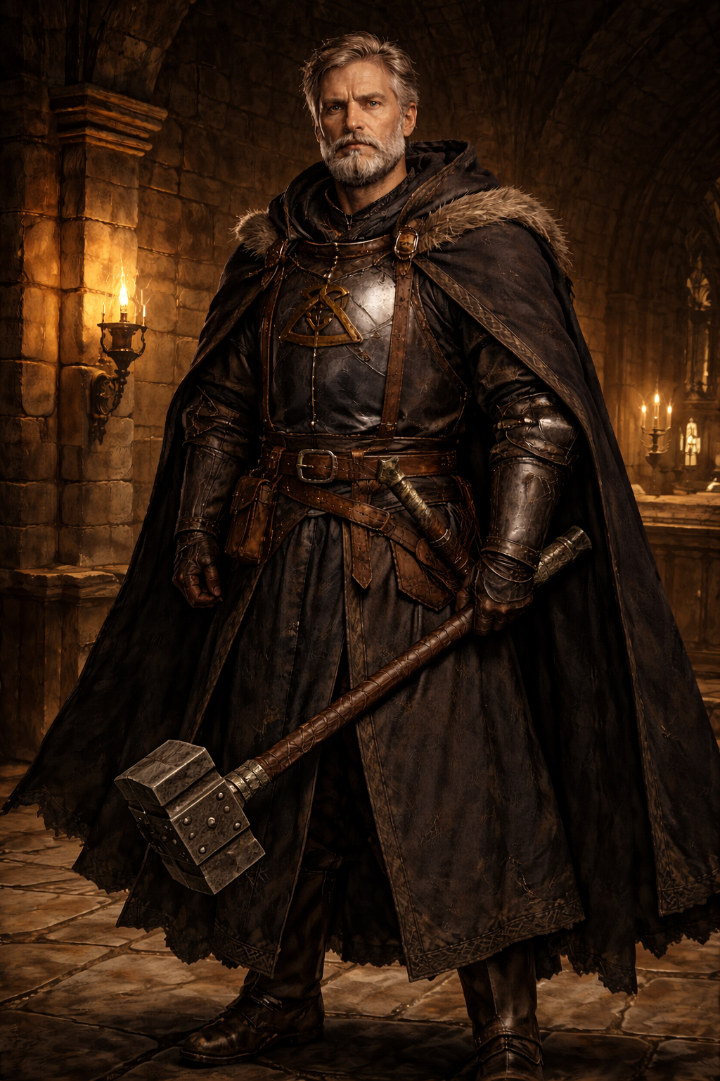 Aemric Haldvarsson est un homme de cinquante-cinq ans, grand et encore solide malgré les années, dont la chevelure rousse a viré au roux-gris sans jamais totalement capituler. Il a le teint buriné des gens du nord, les mains larges d'un homme qui a longtemps travaillé de ses bras avant de prendre les ordres, et une voix de basse qui porte naturellement dans une salle ou contre le vent. Il s'habille sobrement — robe de laine sombre, symbole d'Odin en bronze martelé sur la poitrine — et porte son marteau de guerre avec la même évidence qu'un artisan porte ses outils.