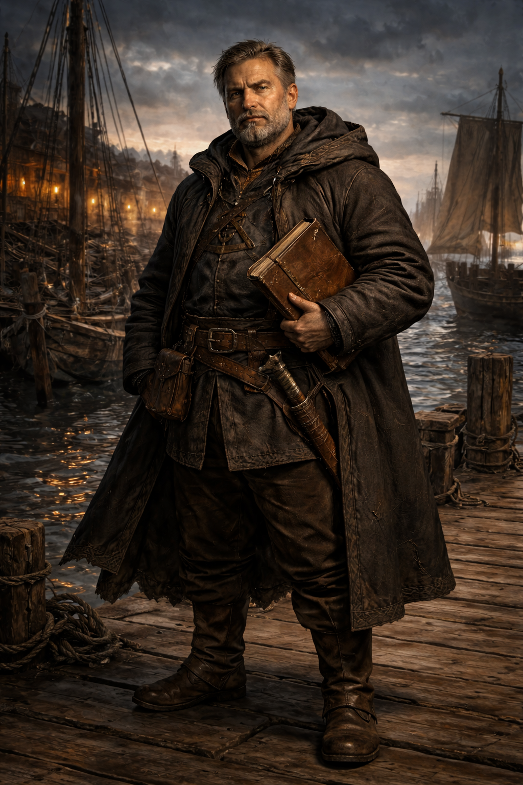 Équipement : Couteau de marin, registres du port (codifiés à sa façon), clés des entrepôts